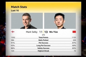 数据落后但能赢!吴宜泽全场数据全面落后塞尔比,单杆最高仅72分
