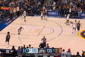 进攻时间所剩无几,约基奇假装给球又收球,结果被对手逼了个争球,跳球约基奇也没跳,个人失误+1