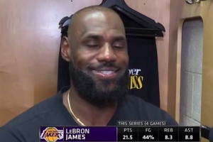 体育资讯4月28日讯 昨日湖人96-115客场不敌火箭,系列赛大比分变为3-1。赛后,湖人球星詹姆斯接受采访时发生了搞笑的一幕。