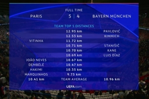 巴黎全队平均跑动10.41公里,拜仁平均跑动10.96公里
