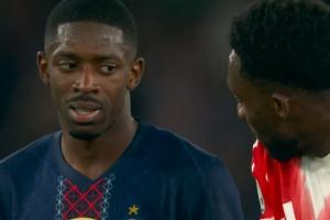 VAR介入后主裁亲自观看回放判点,巴黎获得点球,登贝莱主罚打进。