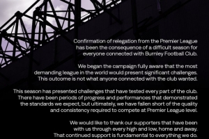 伯恩利发布降级公告:“确认从英超联赛降级,对于伯恩利足球俱乐部的每一位相关人员来说,都是一个艰难赛季的结局。