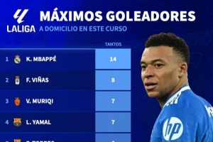 本赛季西甲客场进球榜:姆巴佩14球居首,亚马尔7球、莱万6球