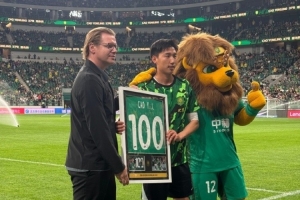 在本赛季中超国安不敌蓉城的比赛中,曹永竞第100次代表国安出战。今天对阵津门虎赛前,国安总经理马永明为曹永竞颁发100场纪念球衣。