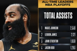 至此,哈登季后赛生涯助攻总数超越托尼·帕克,上升至NBA历史第六位,排在他前面的是保罗。